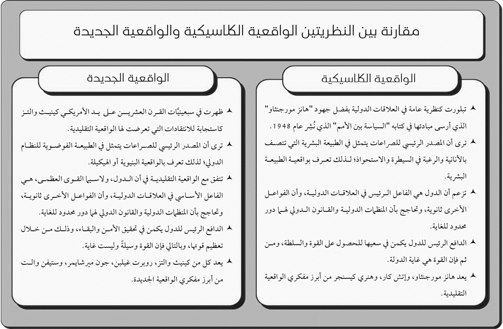 وفيما يستند الواقعيون التقليديون، أمثال هانز مورجنثاو وهنري كيسنجر، إلى معطيات السياسة الداخلية في تحليلهم للصراع الدولي، ينطلق الواقعيون الجدد في تفسيرهم لهذا الصراع من بنية النظام الدولي[4]، إذ يرون أنه سواءً أكانت الدولة ديمقراطية أم استبدادية، فإنَّ ذلك لا يشكل أهميةً كبيرة بالنسبة إلى الكيفية التي تتصرف الدولة بها تجاه غيرها من وحدات النظام الدولي، ومن ثمَّ يتعامل الواقعيون الجدد مع الدول بوصفها صناديق سوداء، فهي تبدو متشابهة غير أن الاختلاف بينها يكمن في وجود دول قوية وأخرى أقل قوة[5].